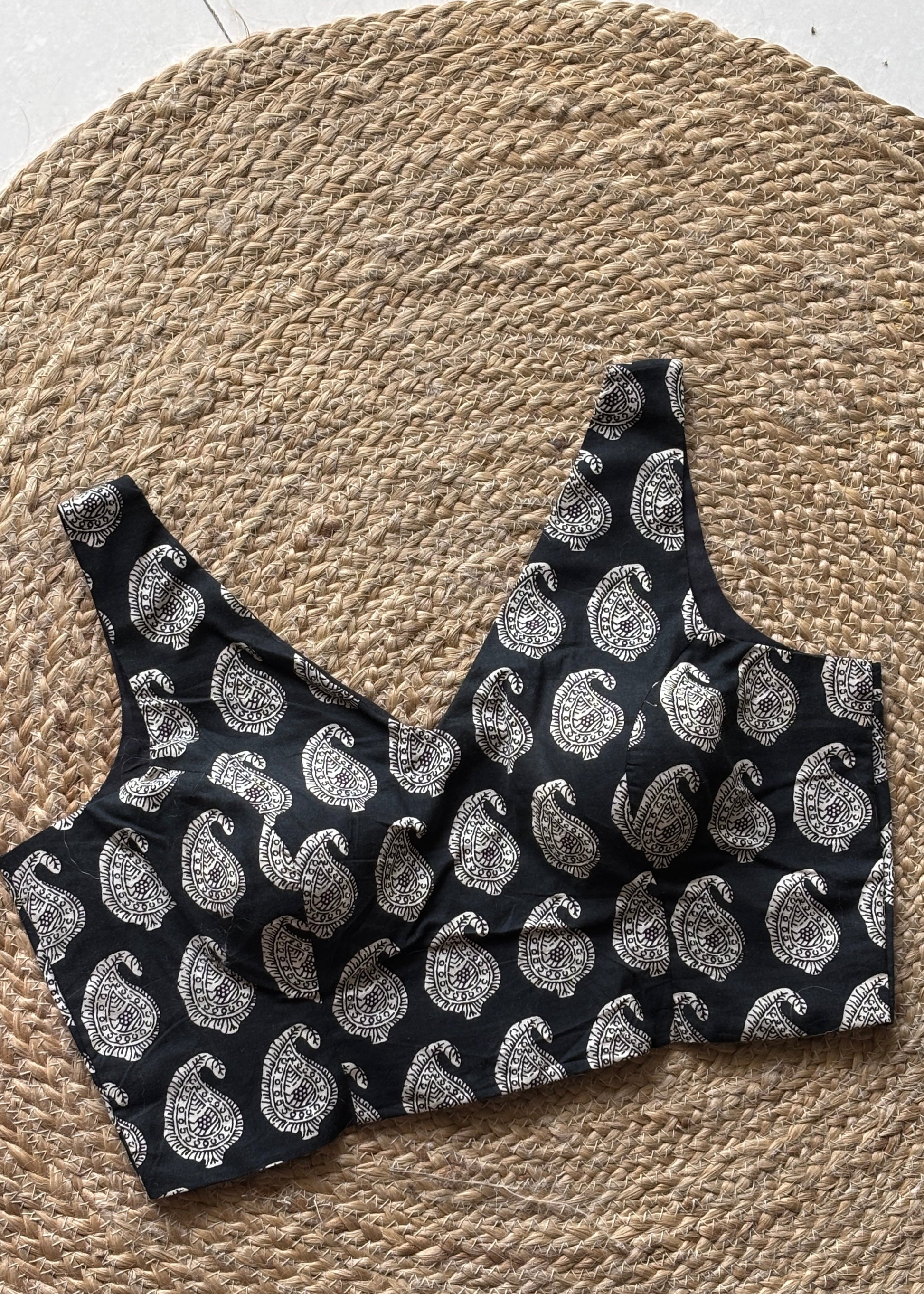 A timeless classic, the Kalindi Paisley Cotton Blouse comes in a striking white-on-black palette. The intricate paisley motifs add a touch of heritage charm, while the deep neckline and sleeveless cut lend it a modern edge. Made from soft, breathable cotton, this versatile blouse pairs beautifully with sarees for both festive occasions and everyday elegance.