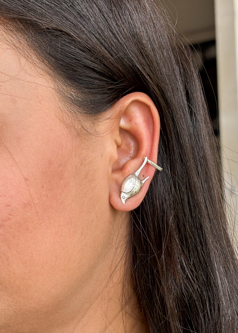 A silver replica ear cuff crafted in the form of a delicate bird in mid-flight, hugging the ear with effortless grace. Its smooth contours and minimal detailing add a touch of rustic charm, making it an elegant fusion of nature-inspired artistry and contemporary style.