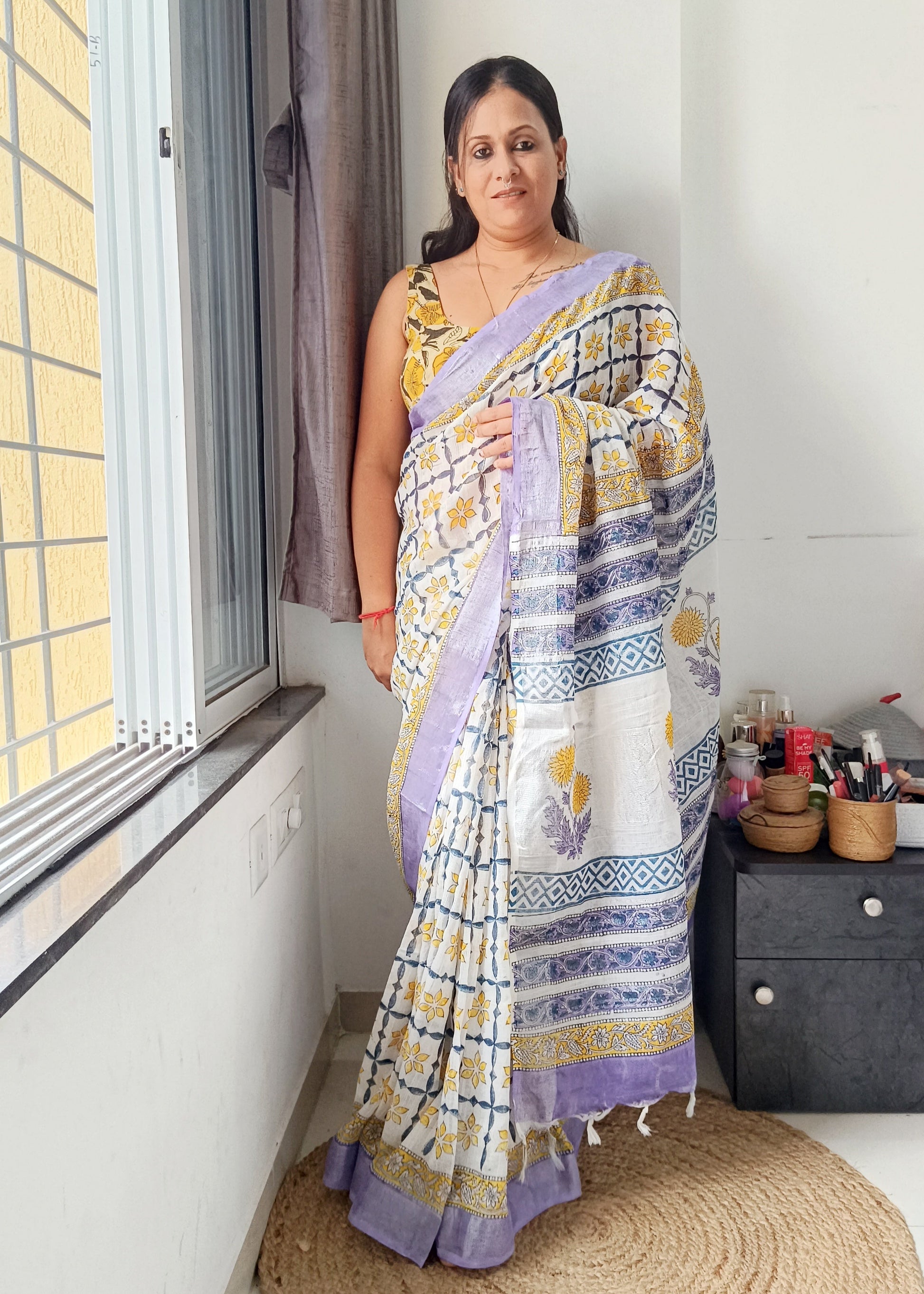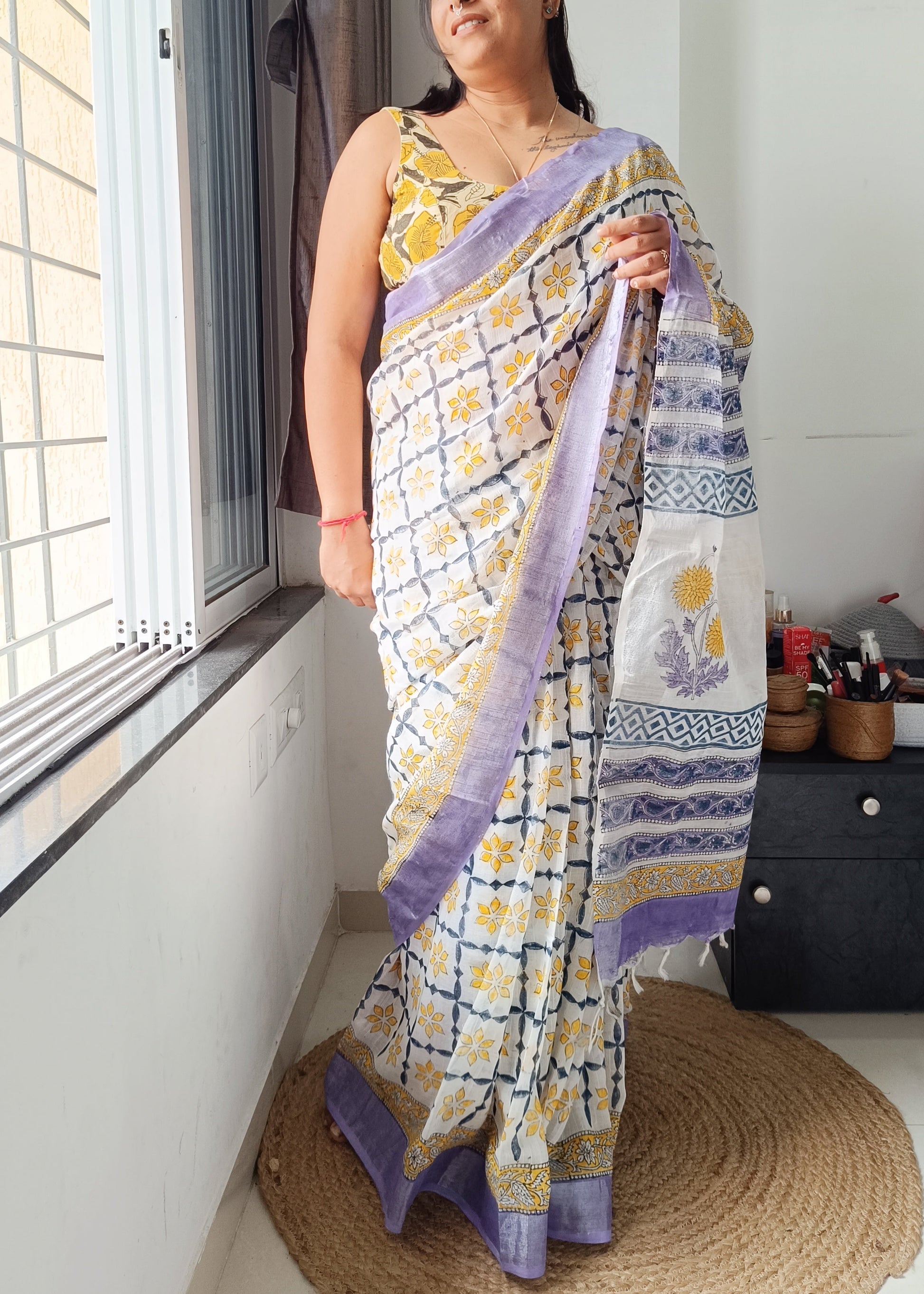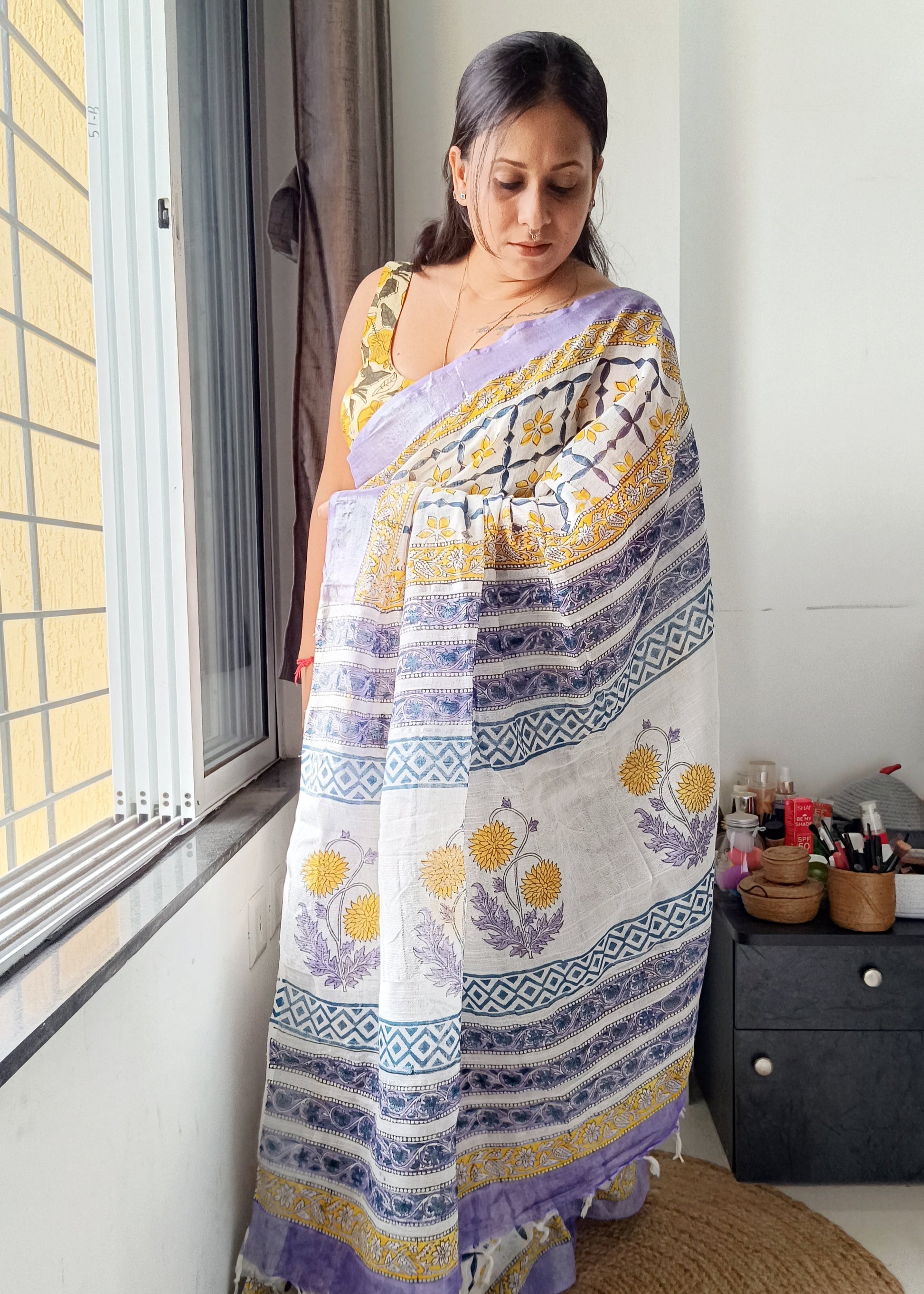 A cheerful and bright saree, Phoolmati celebrates block-printed florals in shades of yellow and blue, accented with lavender and gold borders. This saree brings nostalgia and freshness in equal parts — perfect for day outings and meetups.