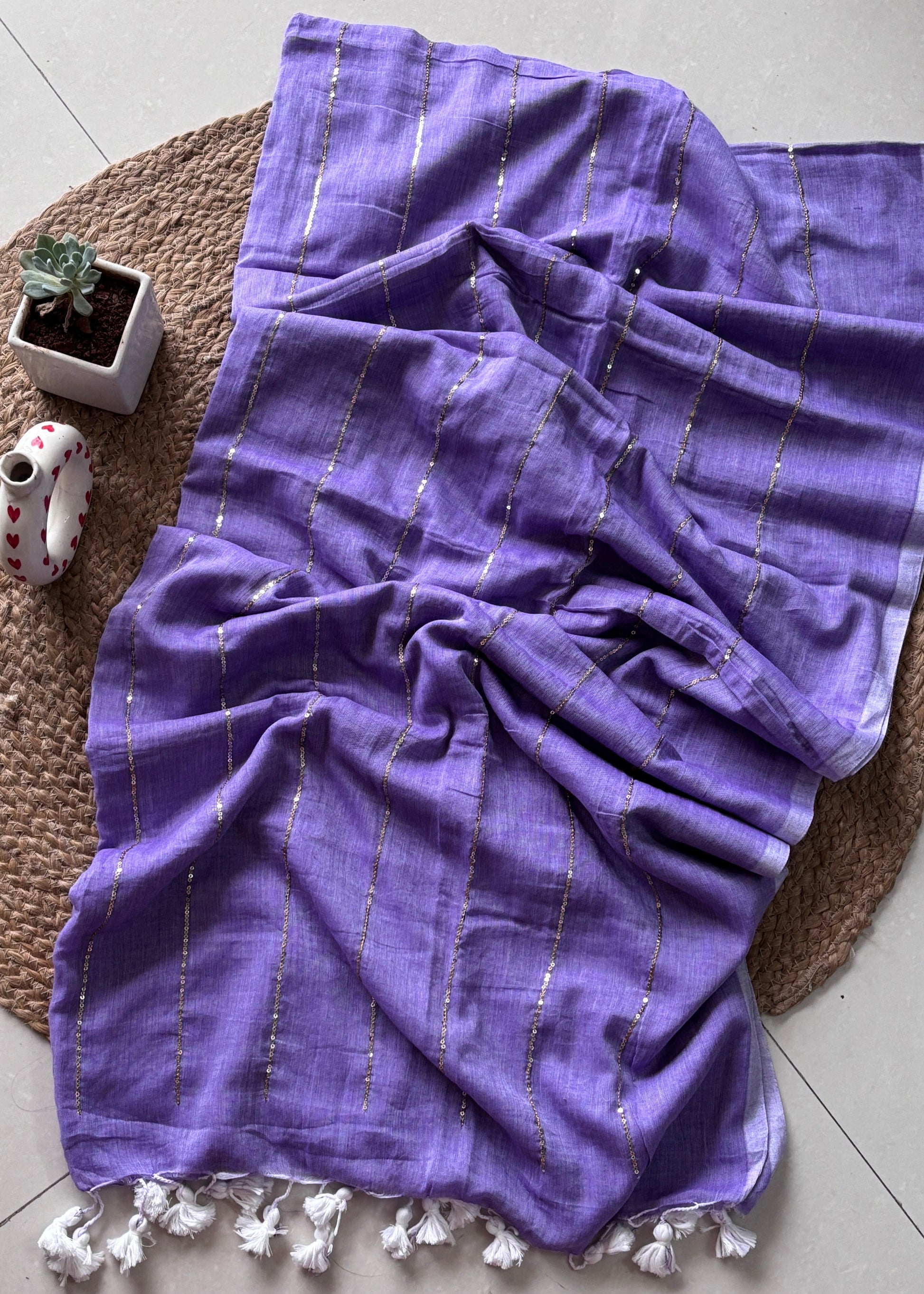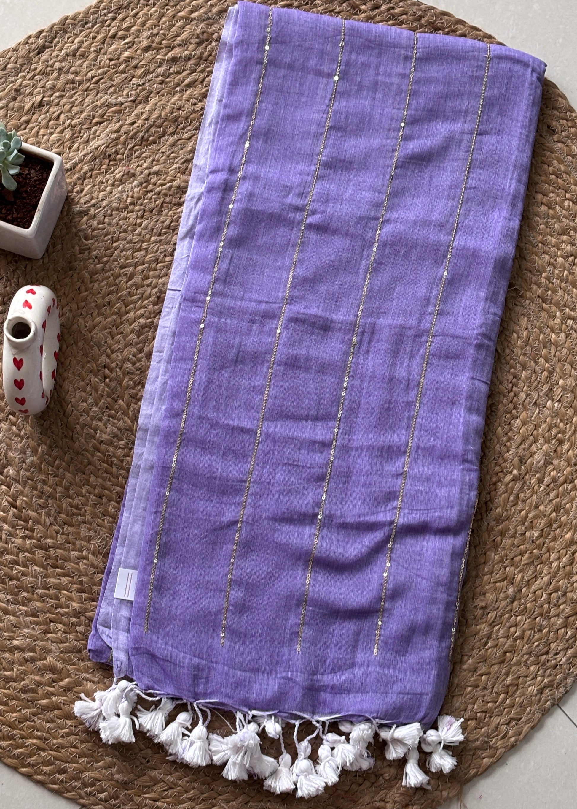 Bold, breathable, and beautiful — Raatrani is a rich magenta mul cotton saree that blends comfort with quiet glamour. Accented with vertical lines of dainty sequins and finished with handmade tassels, it’s a piece that whispers elegance in every drape. Ultra-soft against the skin, this saree is perfect for all-day wear — from morning meetings to moonlit moments.