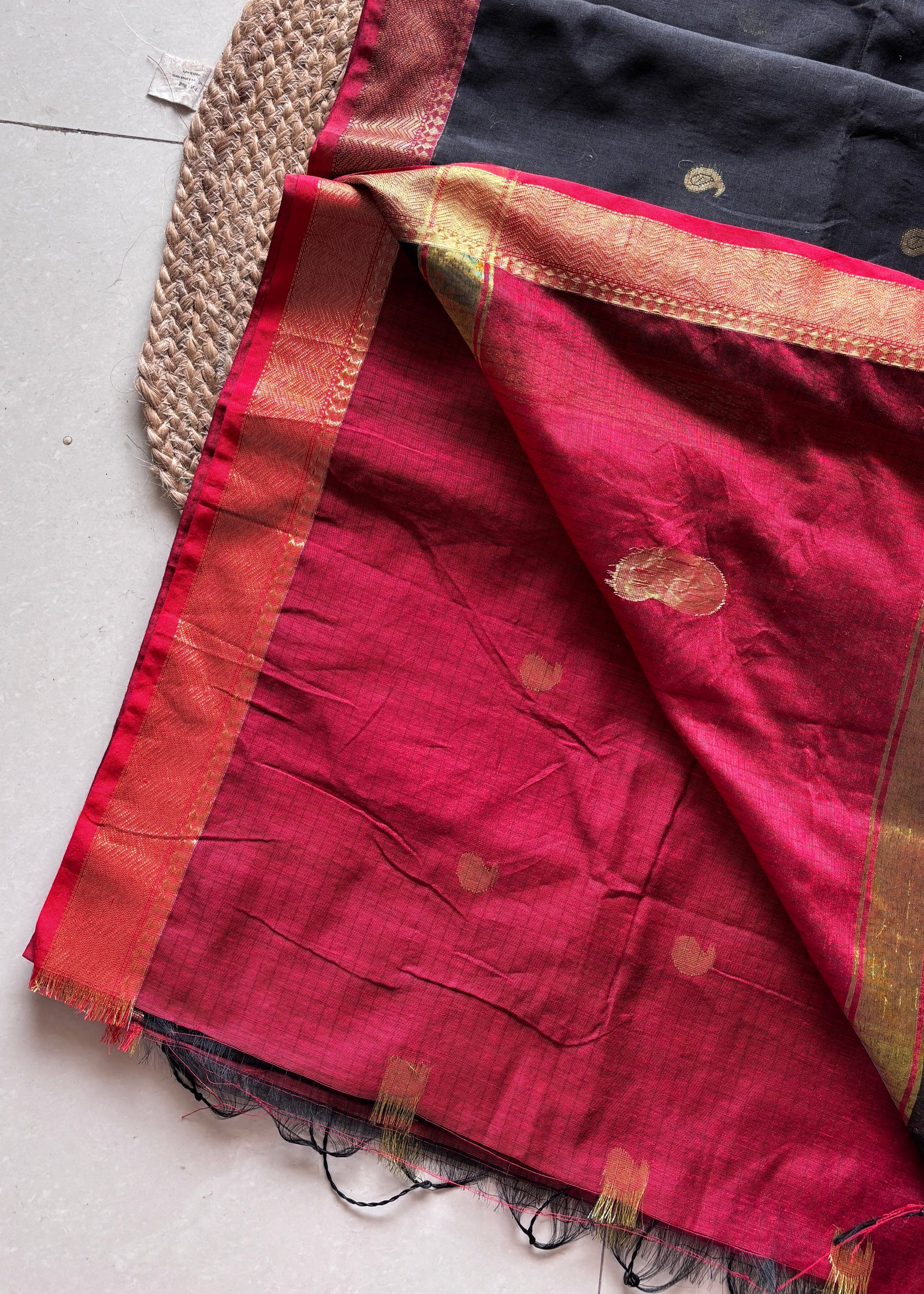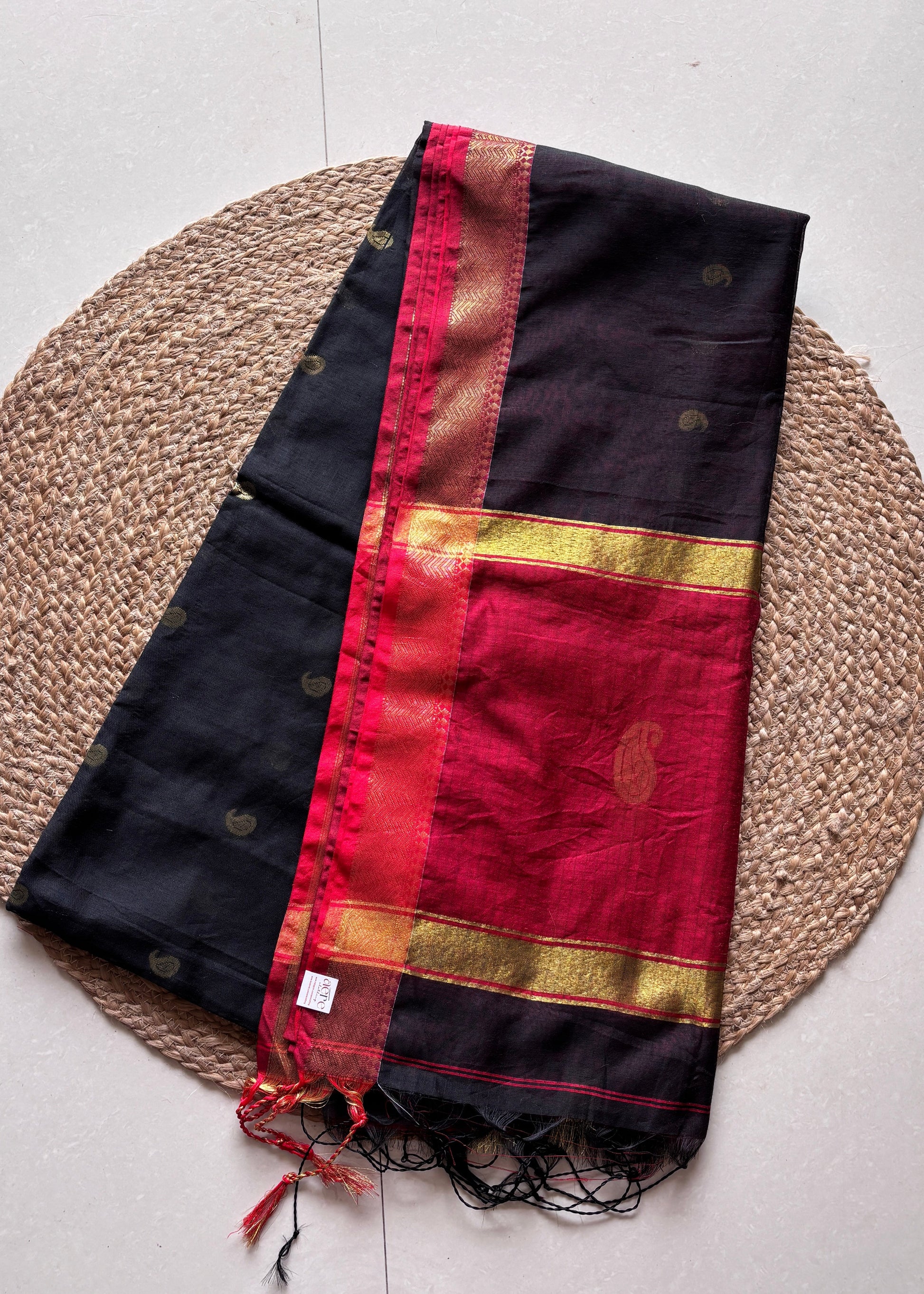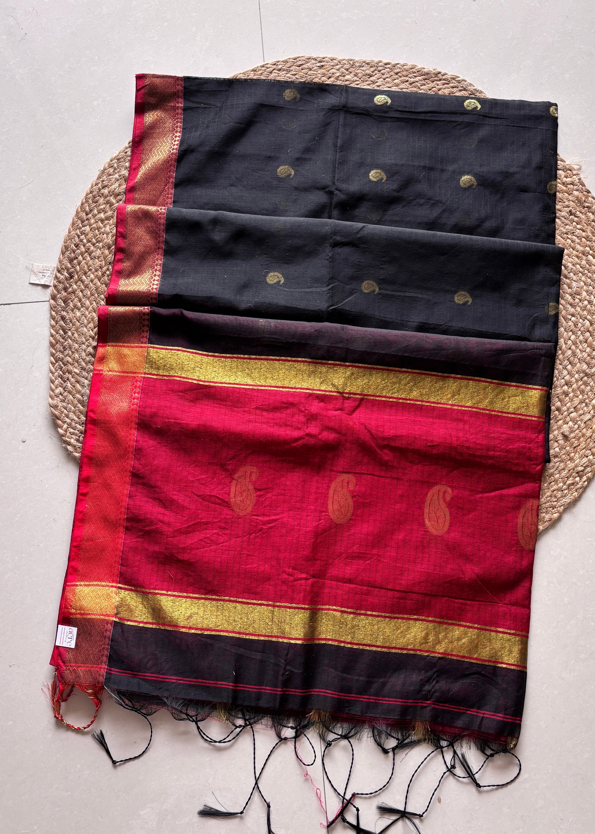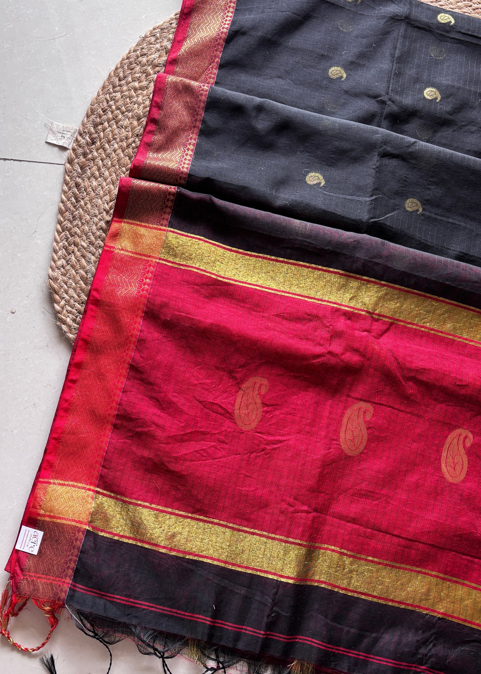 A powerful play of deep black and bold red, this saree echoes the energy of thunder and earth. The golden zari glimmers like lightning through storm clouds, while paisley butas lend a touch of timeless grace. Strong, rooted, and unmistakably striking — a drape that speaks in silences and stuns in presence.