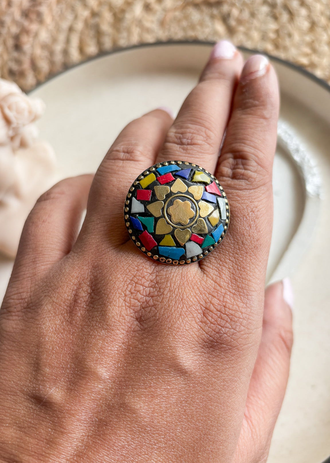 Elevate your ensemble with our exquisite Gunj Ring, featuring a distinctive multicolor Afghani round design. This artisanal piece showcases intricate craftsmanship with vibrant hues arranged in a traditional circular pattern, offering a refined statement of cultural elegance. Perfect for those who appreciate sophisticated ethnic accessories with timeless appeal.