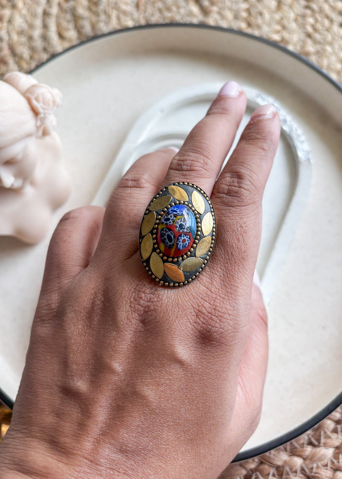 Rooted in Afghan heritage and crafted with vibrant soul, the Kaala Meher ring is a celebration of contrast and culture. Its laq-finished oval face is adorned with jewel-toned inlays—deep blues, reds, teals, and ivory—set against a bold black canvas. Golden motifs bloom at the center, adding an old-world charm to its bohemian spirit. Statement-making yet timeless, this ring turns every gesture into a quiet rebellion of style.