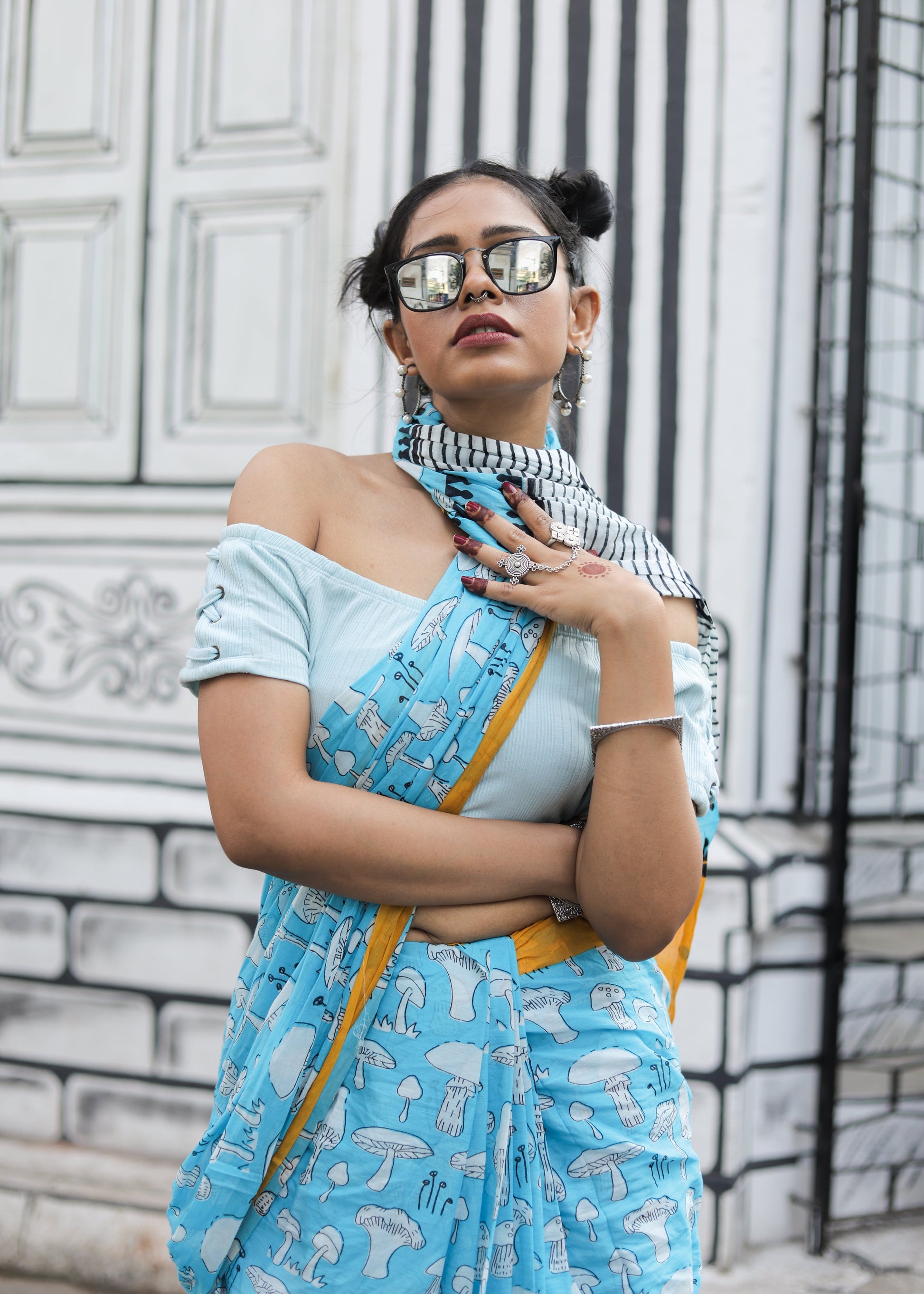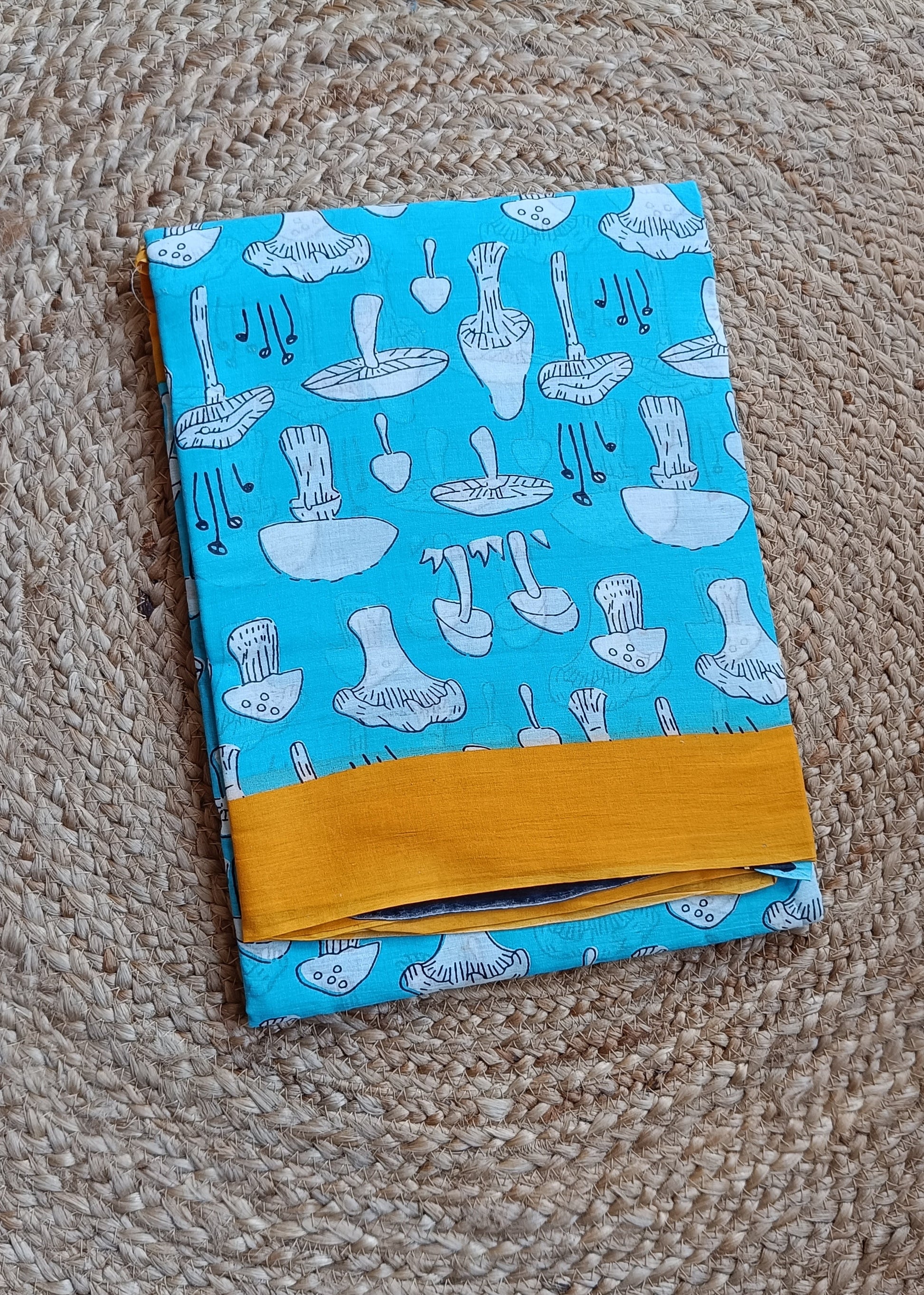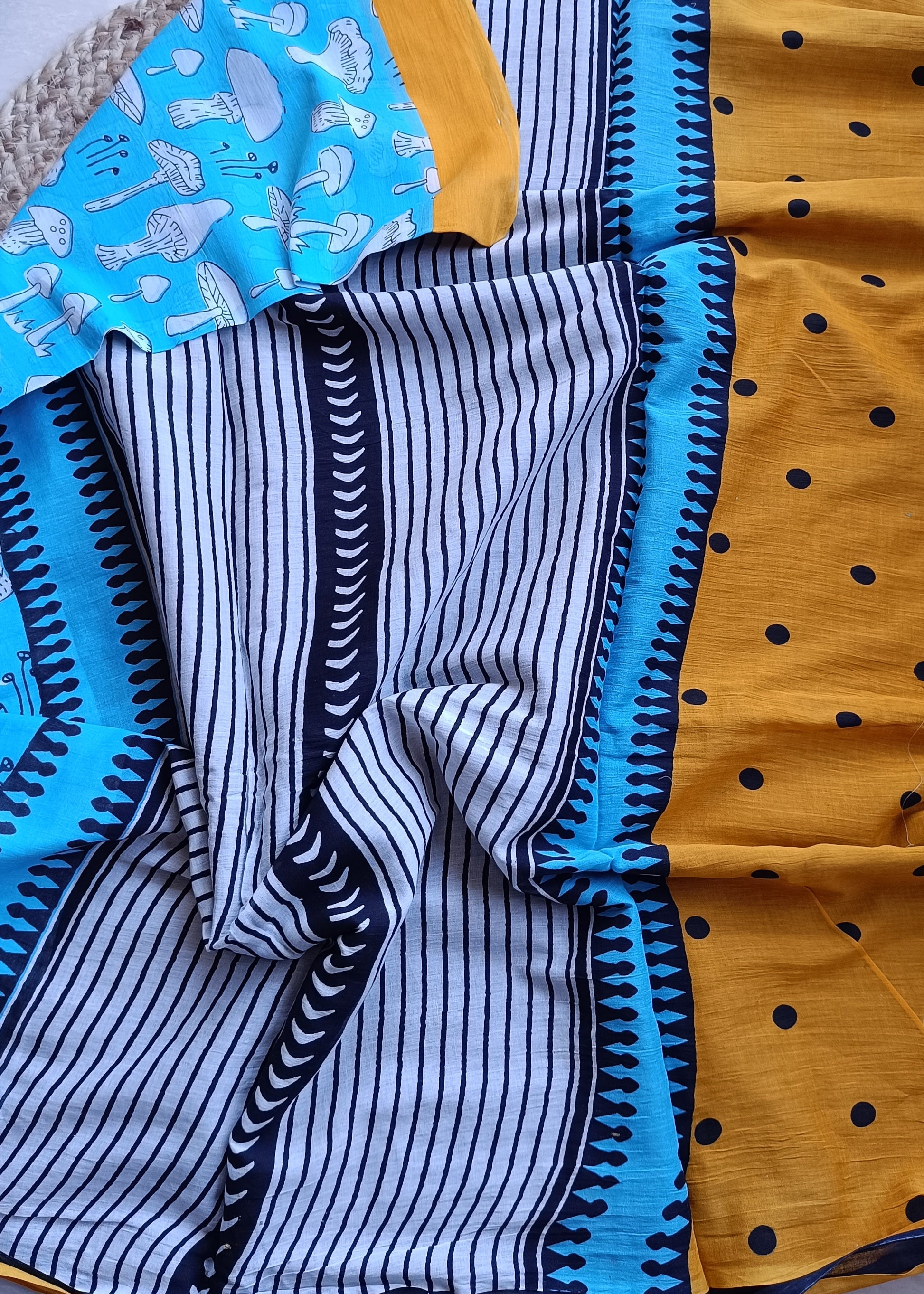Immerse yourself in refined elegance with our Sky Mushroom Print Mul. This exquisite fabric showcases a serene sky blue canvas adorned with charming white mushroom motifs, creating a sophisticated yet whimsical appeal. The vibrant yellow border provides a striking accent, while the contrast pallu completes this distinctive textile with artistic finesse—perfect for those who appreciate subtle luxury with character.