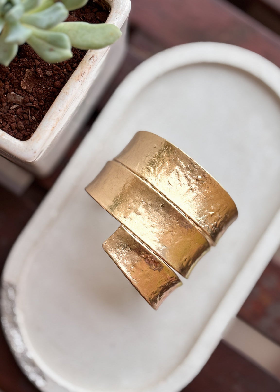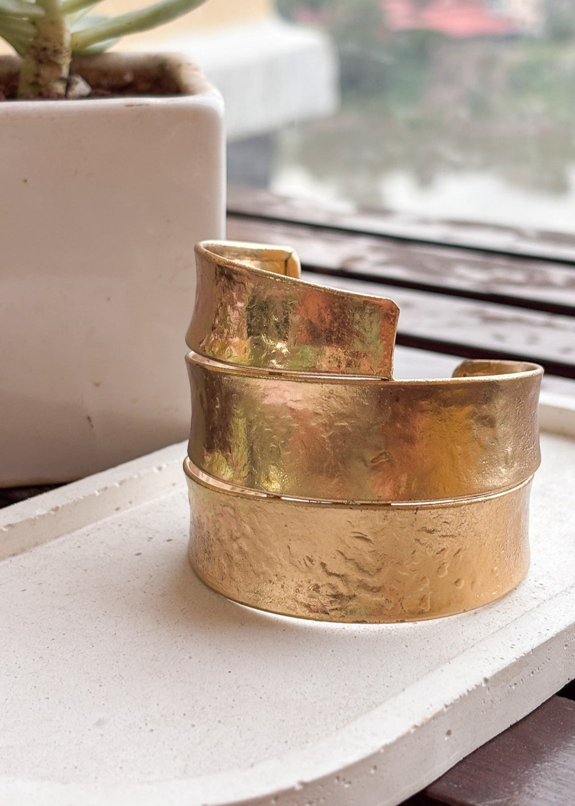 Bold yet timeless — the Sonaal Cuff is handcrafted in pure brass with a hammered finish that carries raw texture and subtle shine. Designed as a wide statement bangle, it wraps your wrist in effortless strength and elegance. Perfect to style solo for a minimal look or stack for a powerful, bohemian edge — this piece celebrates the beauty of handcrafted imperfection.