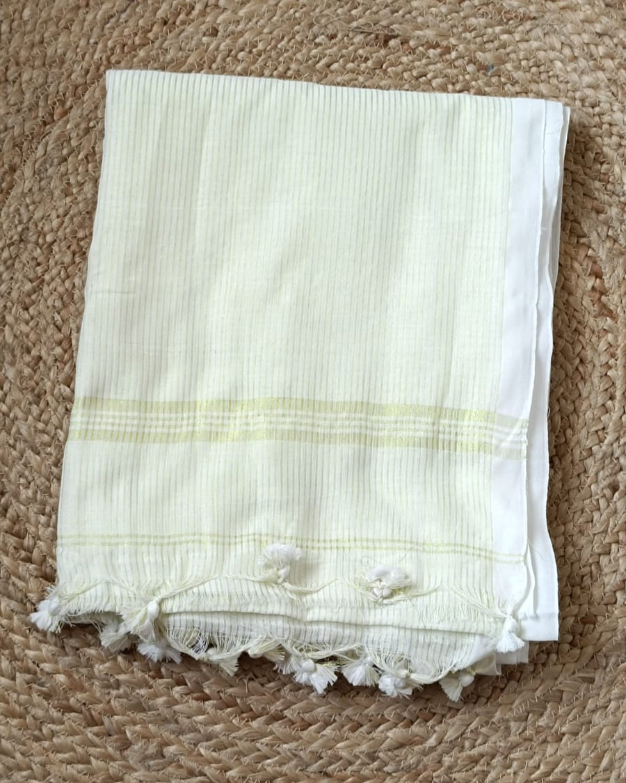 Exquisite handloom cotton sarees featuring delicate zari stripes meticulously woven throughout the fabric, creating a subtle yet sophisticated shuttle shine. These premium Khadi pieces exemplify traditional craftsmanship with contemporary elegance, complete with tasteful tussle detailing. A timeless addition to any discerning collection.