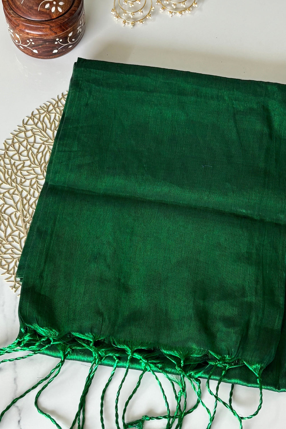 This dark green saree is crafted from soft mul tissue cotton, offering a feather-light texture that ensures comfort throughout the day. Its elegant simplicity highlights timeless sophistication, making it an excellent choice for those who appreciate refined traditional artistry combined with modern elegance.