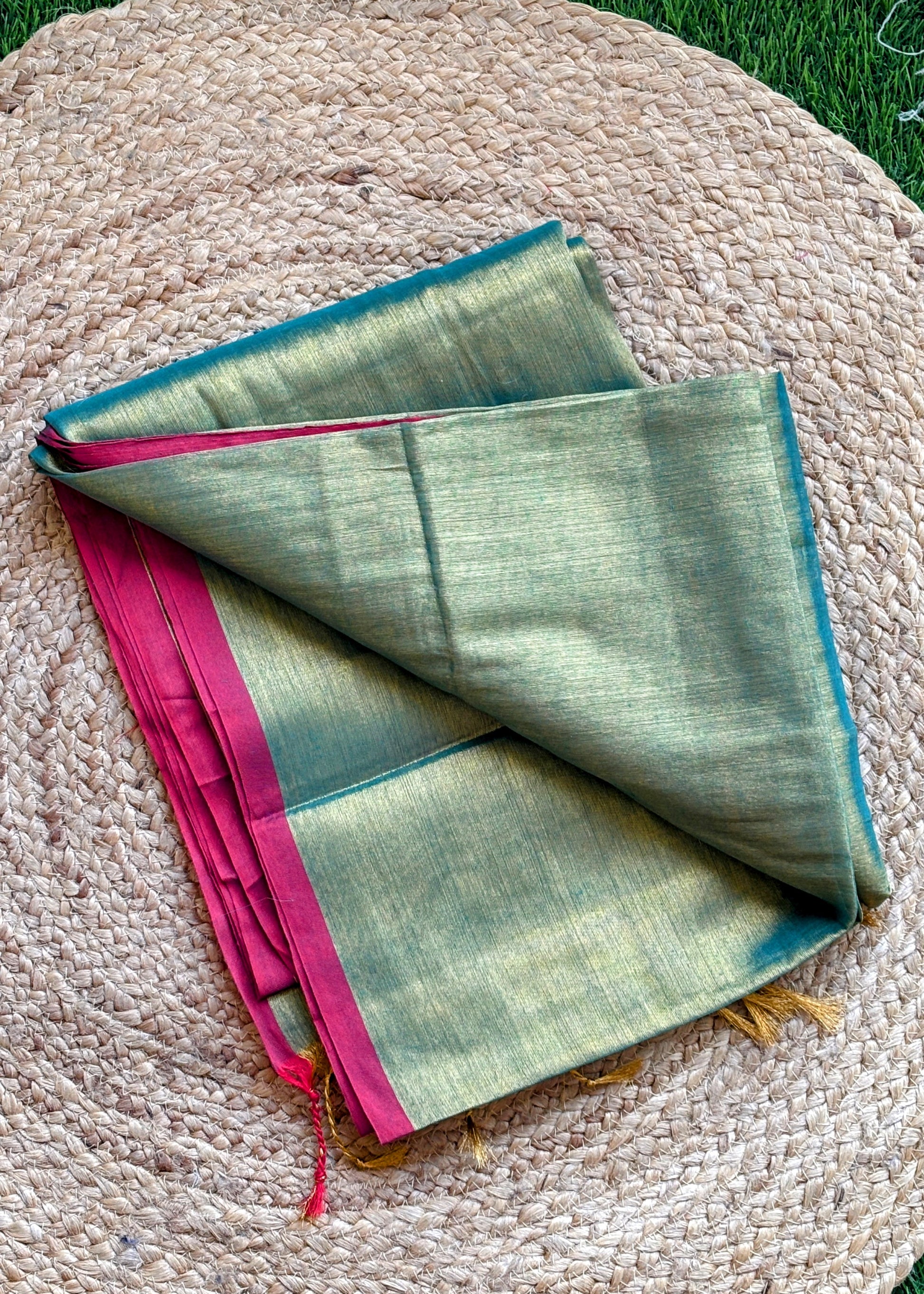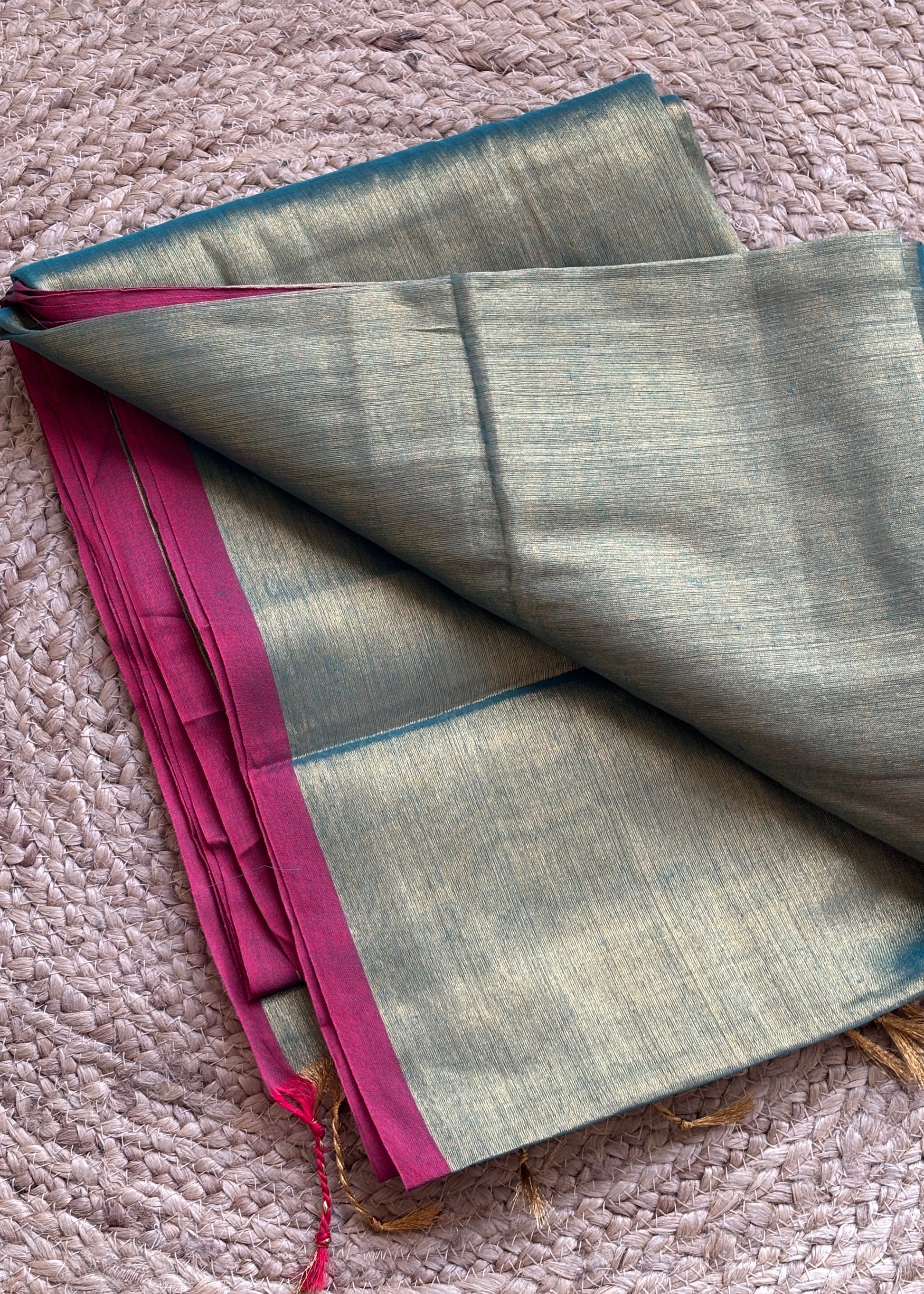 This elegant saree in dusty olive green is woven from soft mul tissue cotton, enhanced with subtle light gold threads that add a refined shimmer. Its feather-light texture ensures comfort while exuding timeless sophistication, making it an ideal choice for those who appreciate a blend of traditional artistry and modern elegance.