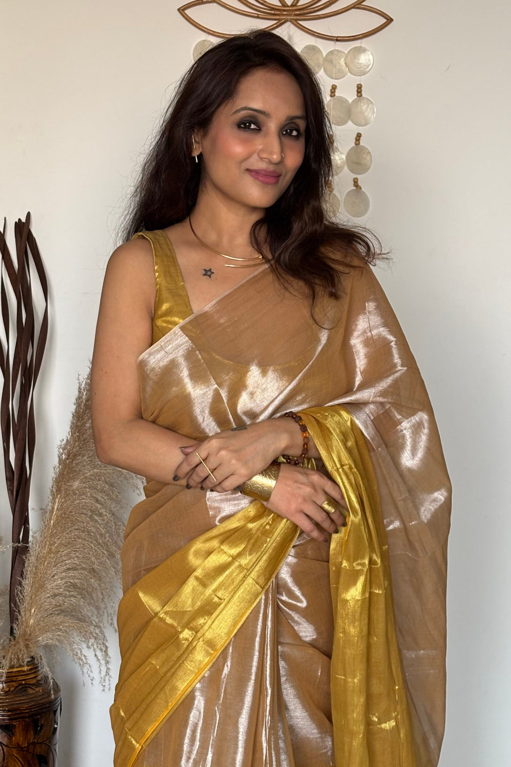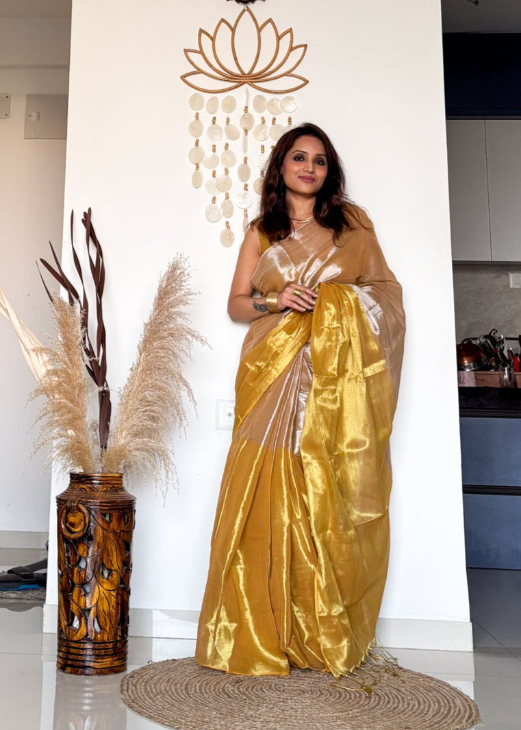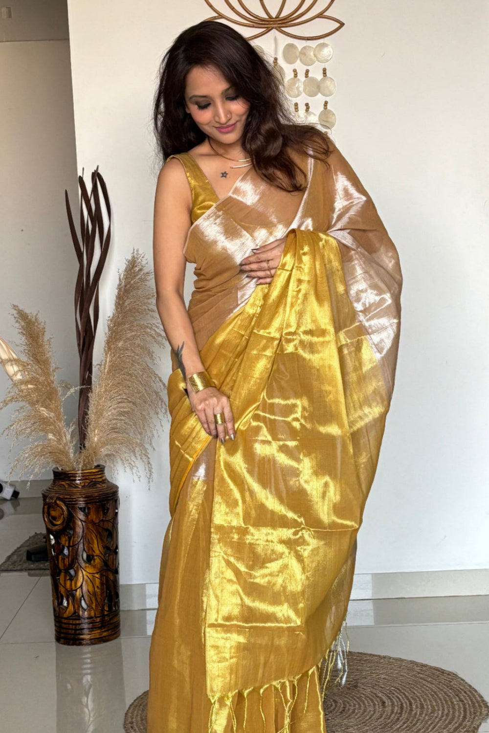 Elevate your elegance with the Raga Tissue - Golden Half & Half saree, featuring a refined blend of golden and beige hues in a half-and-half design. Crafted from lightweight mul tissue fabric, this saree drapes gracefully, offering a sophisticated silhouette perfect for special occasions. Its subtle shimmer and harmonious color contrast make it a timeless addition to your wardrobe.