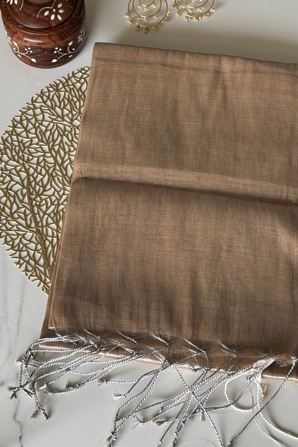 Elevate your elegance with the Raga Tissue saree in a refined Champagne Beige. Crafted from delicate mul tissue fabric, this saree offers a lightweight, graceful drape that enhances your silhouette. Its subtle hue and fine texture make it perfect for sophisticated occasions, blending timeless charm with understated luxury.