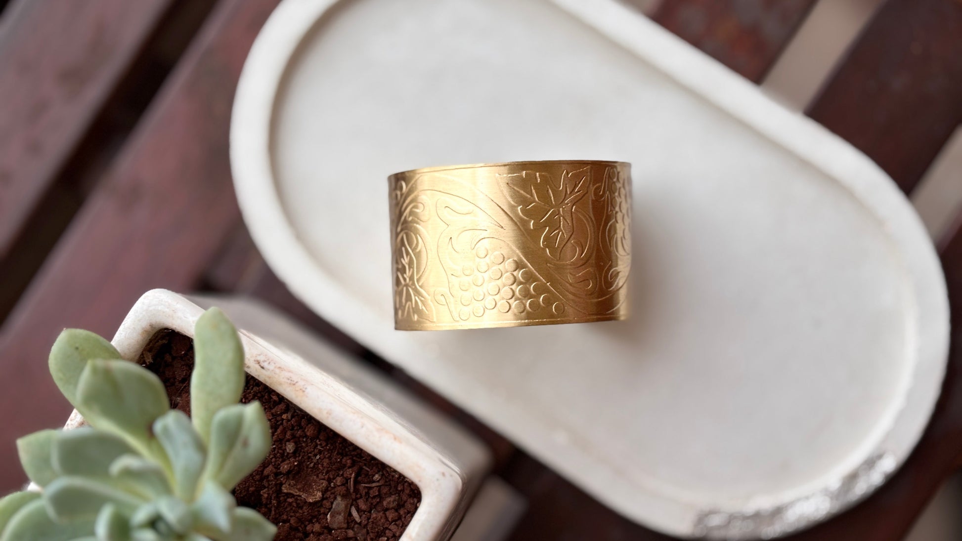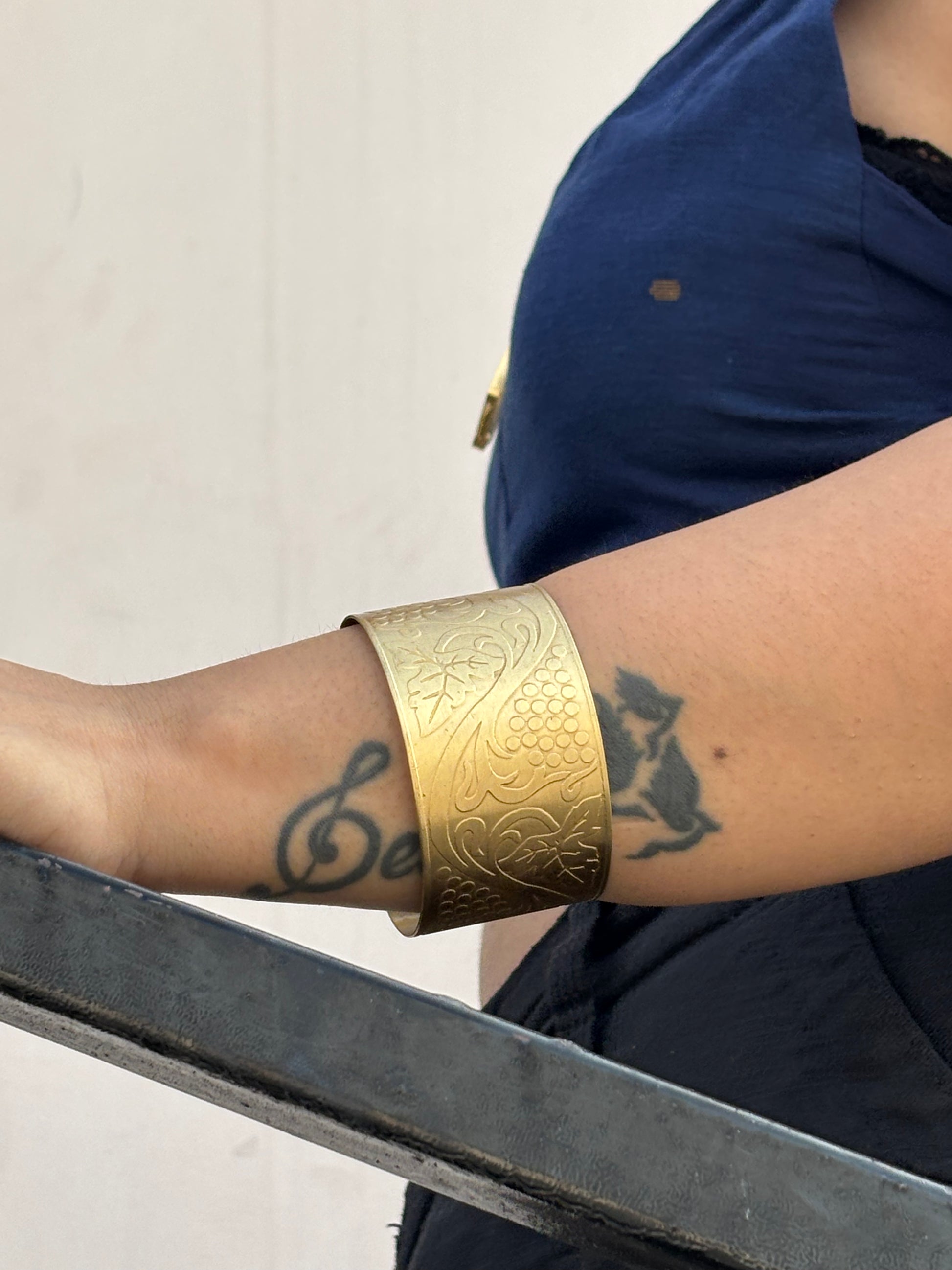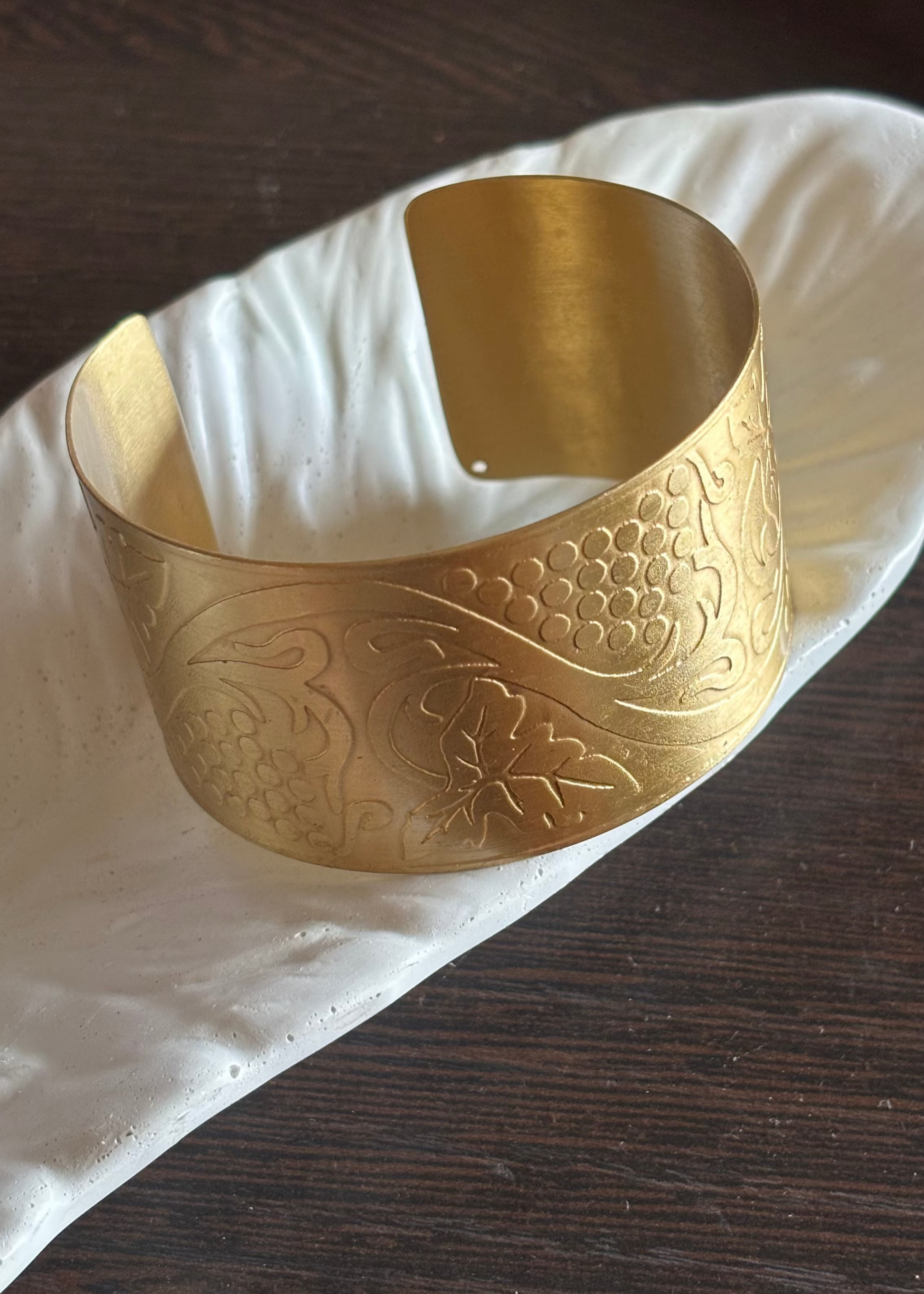 An intricately engraved brass cuff adorned with flowing vine and grape motifs, blending artisanal detailing with timeless elegance. Its wide, sturdy band makes it a bold yet versatile statement piece for any look.