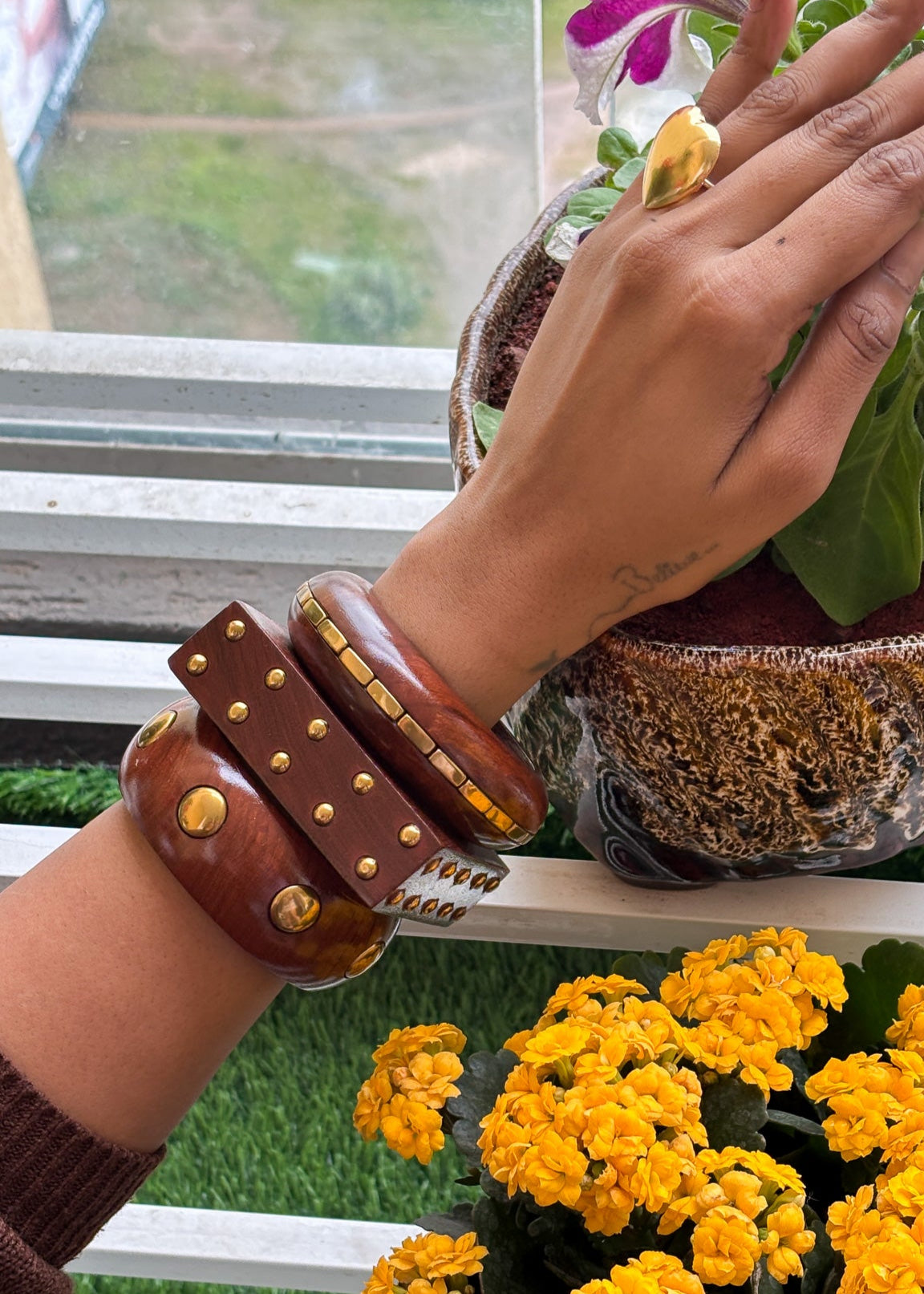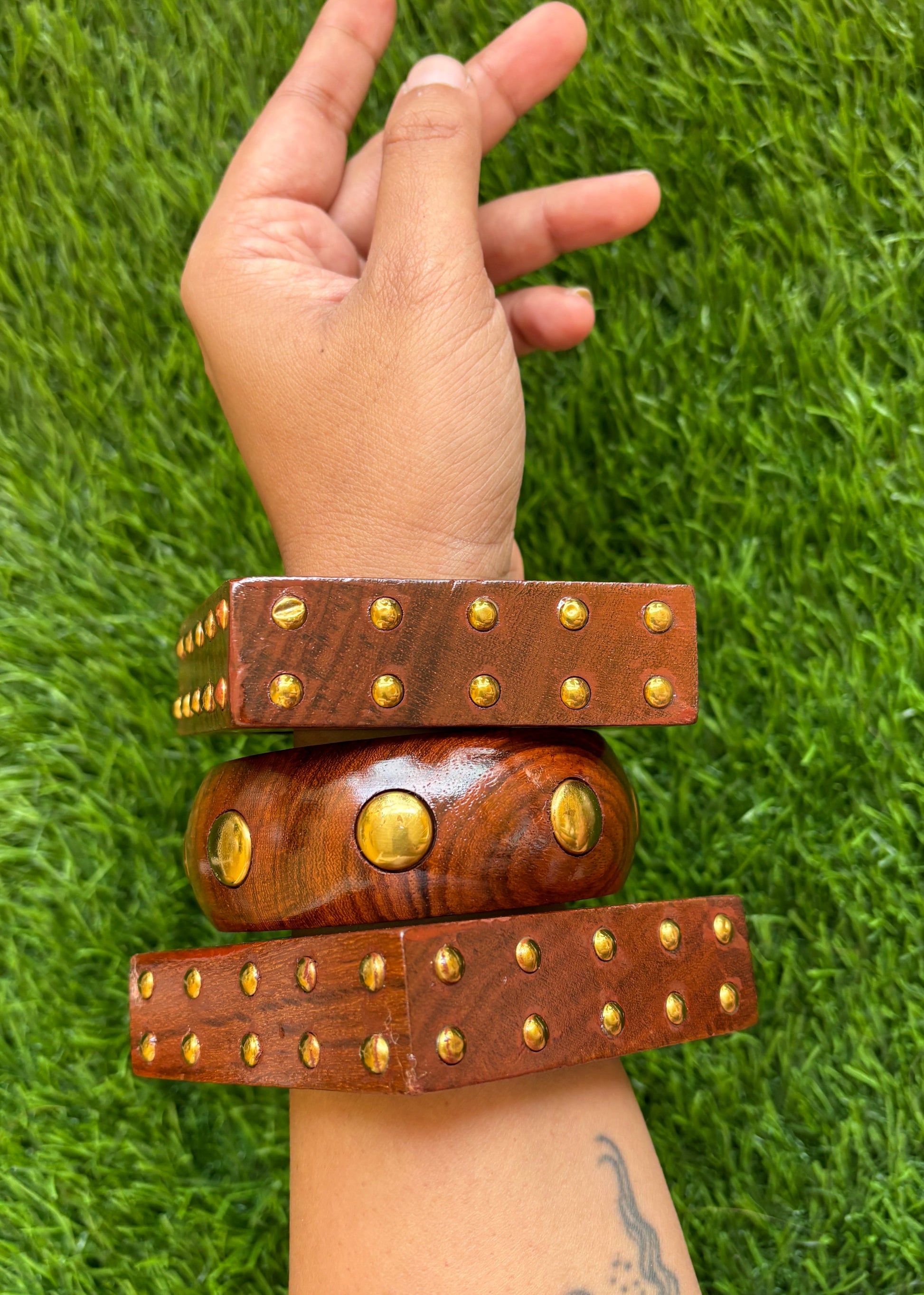 A wide bangle with large golden studs, exuding strength and statement.