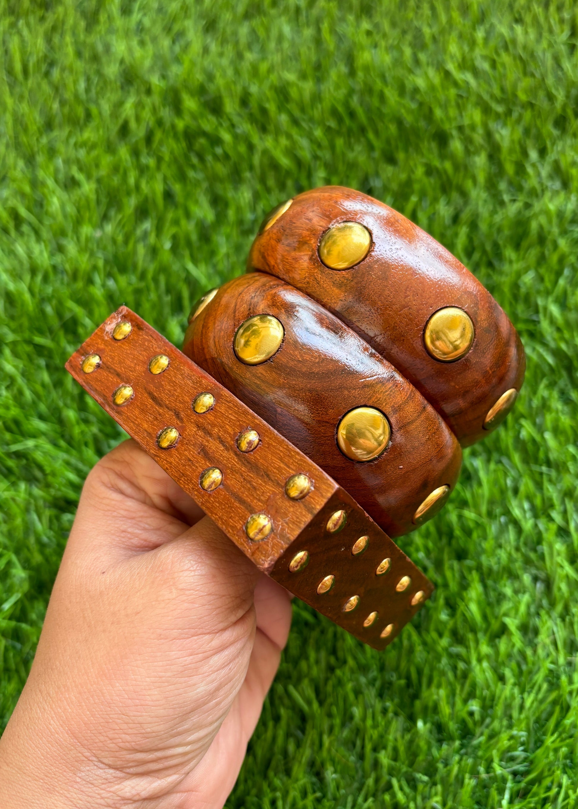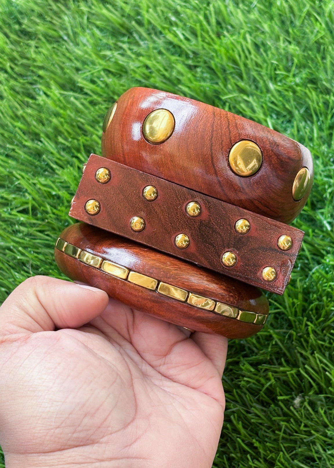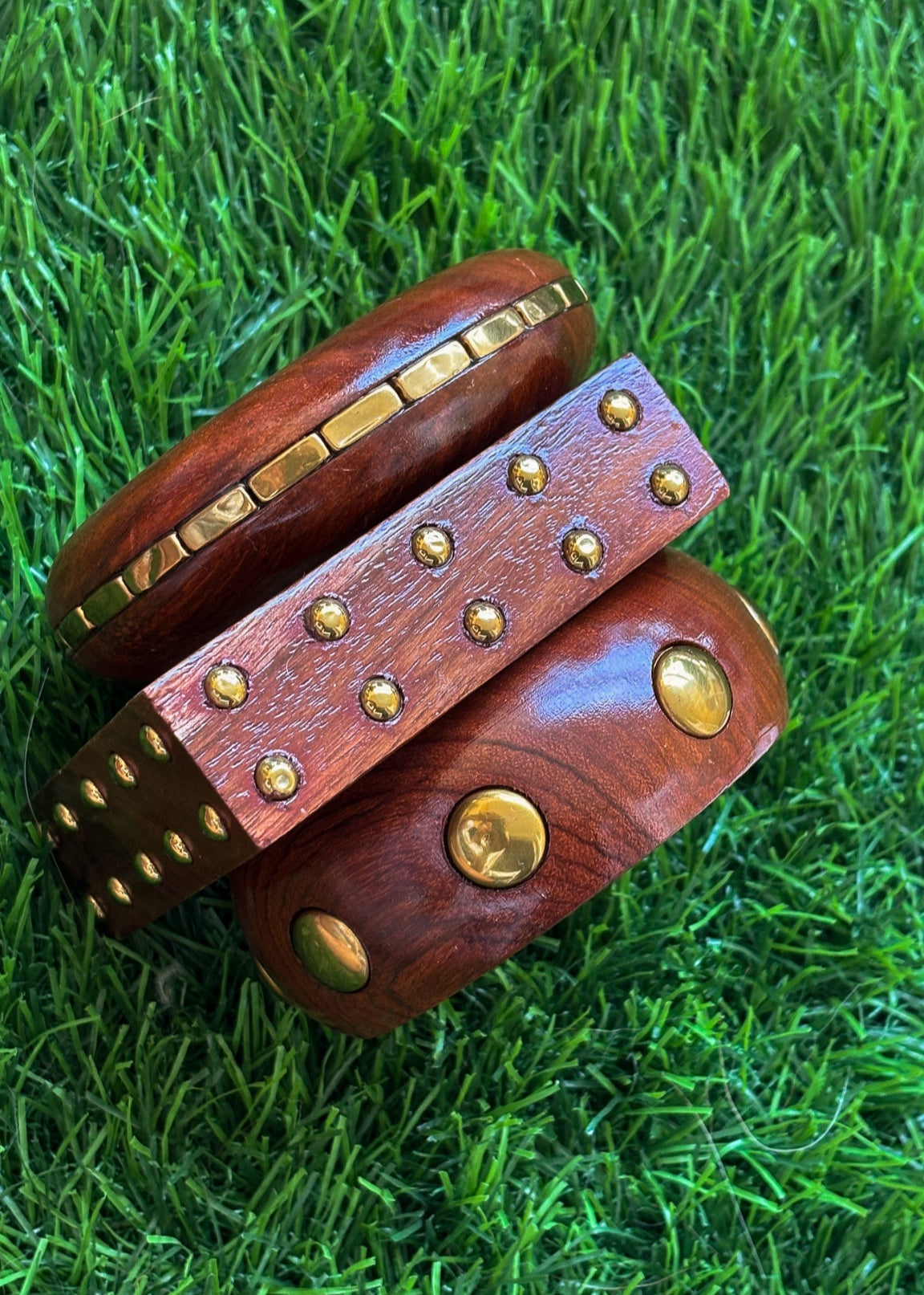 A rectangular-edged cuff with mini brass domes, adding an edge of rebellion.